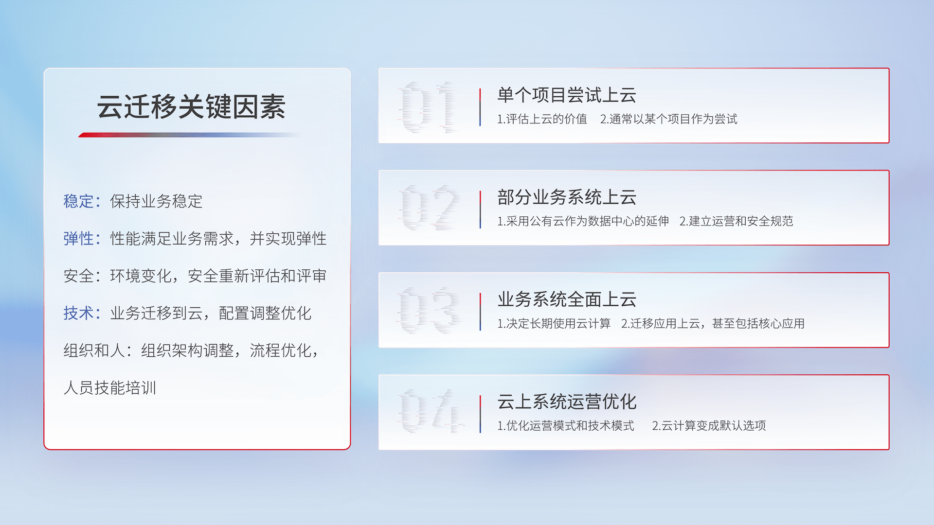 结合实际业务,,,从规划设计、、、、云平台选型、、、云原生改造、、、数据迁移、、、、集成交付,,,,迁移全过程为客户识别最佳上云路径,,,做好风险识别管理,,,,设计网络架构、、身份权限、、、、安全审计合规、、、、操作审计、、、日志审计、、、监控告警策略、、多站点容灾设计等,,,对云上基础设施进行整体规划,,提升IT治理水平,,,以满足弹性、、高可用、、高性能的需求。。。