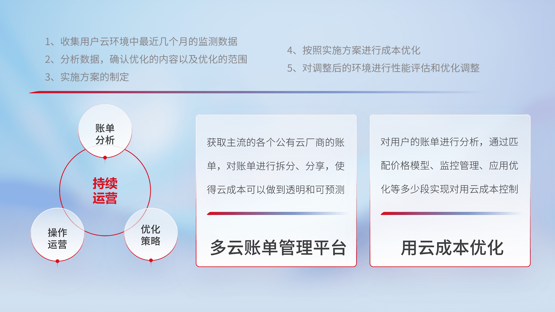 通过多云纳管,,,以统一的资源数据模型把客户的云资源进行抽象和封装,,,,进而实现对多云资源的统一操作,,保障云资源管理的可靠性、、稳定性与可用性。。。。量身定制化运维内容,,配置、、、开发运维、、补丁管理、、、、备份、、、监控、、认证和访问管理、、审计和日常巡检等,,,,保障在用云过程中的可靠度,,稳定度以及高可用率。。。。
