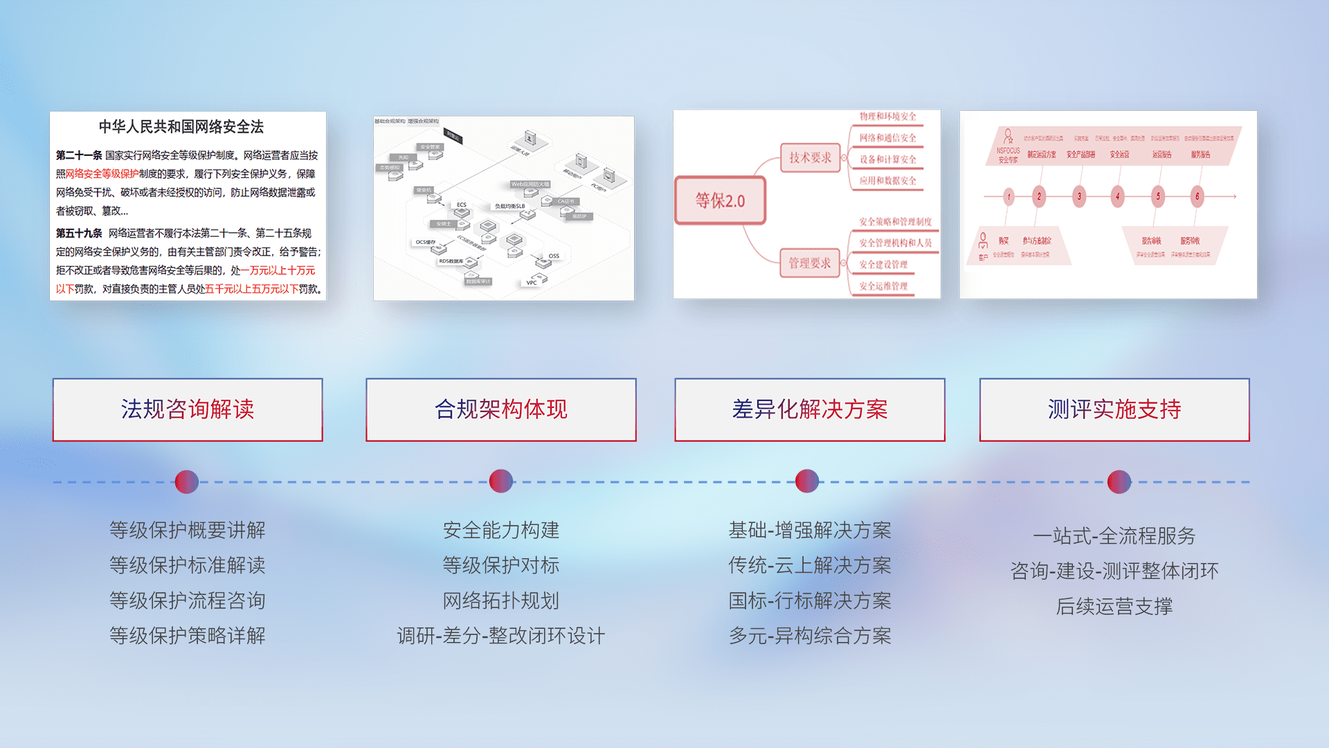 通过专业的法律咨询解读、、、、合规架构体现、、、、差异化解决方案、、、、测试实施支持等服务,,,为客户量身打造等保合规体系。。
